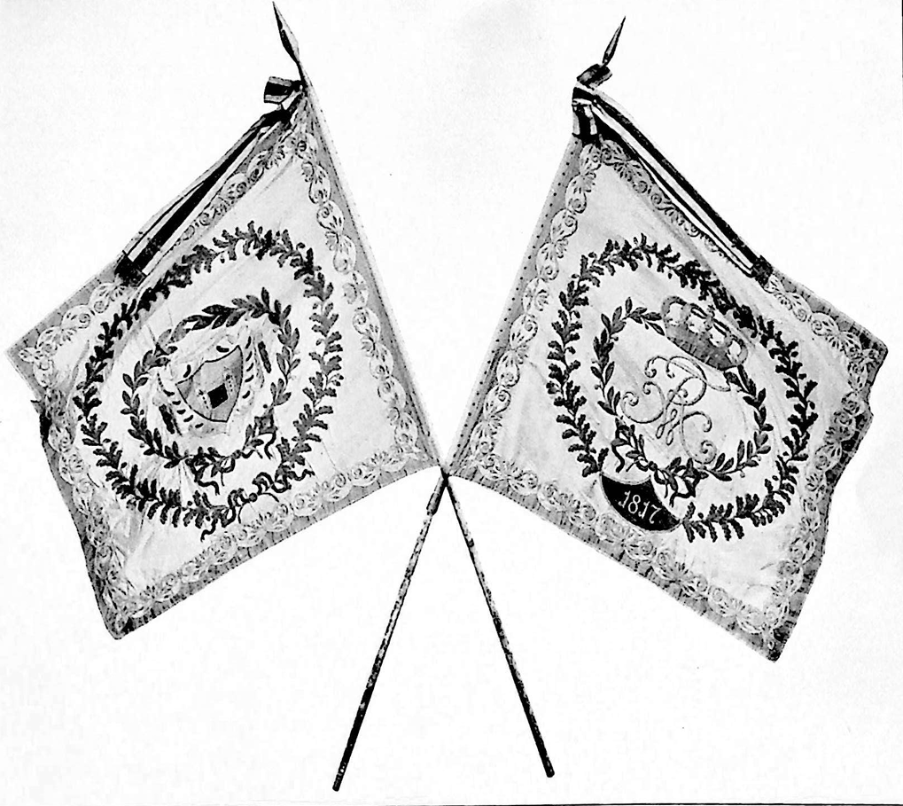 Die erste dieser beiden altsächsischen Militärfahnen besteht aus rotem Grundtuch mit dem Namenszug A. R. und der polnischen Krone, umgeben von zwei Palmenzweigen.