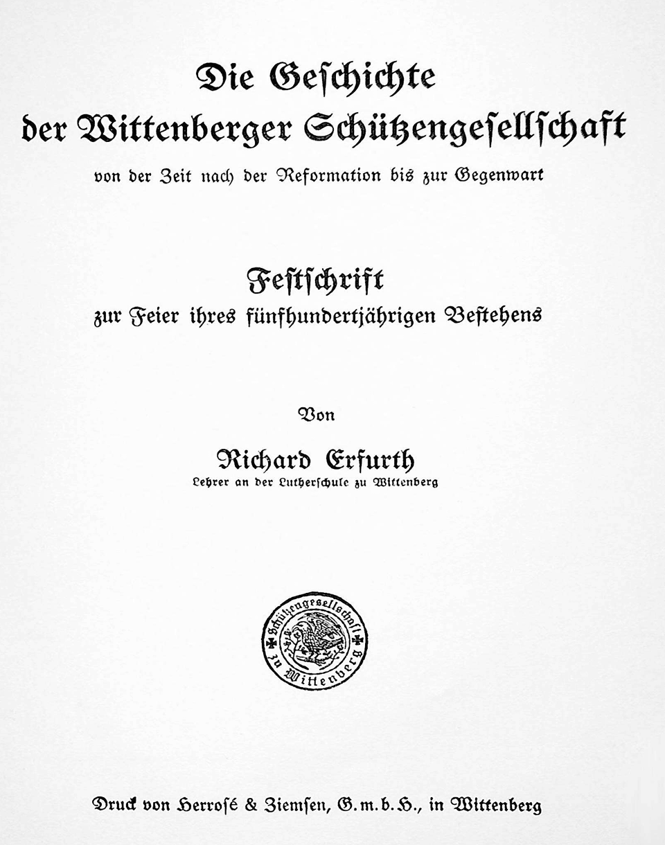 Der Unterzeichnete wurde damit betraut, die Geschichte der Schützengesellschaft von der Zeit nach der Reformation an bis zur Gegenwart zu schreiben, während der erste Teil derselben die Zeit von der Gründung der Gesellschaft bis zur Reformation einschließlich umfassend von dem vortrefflichen Kenner der Geschichte Wittenbergs, Herrn D. Dr. Nikolaus Müller, Professor an der Universität Berlin, bearbeitet wurde.
